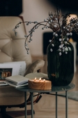 Велика декоративна свічка у кашпо з ясену, спеціально обробленому для безпечного використання (не загоряється).